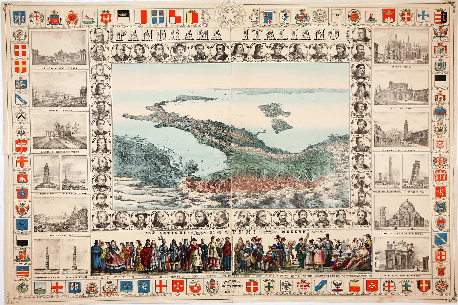 Oggi parliamo di Italia ?? con una rara rappresentazione della penisola. Il “Panorama Italiano” del 1861, è una carta d'Italia celebrativa voluta da #Cavour per festeggiare la nascita del nuovo stato. Rappresenta il paese visto dalle Alpi con i principali uomini illustri, le vedute delle più importanti città, gli stemmi delle città-stato e i costumi dei popoli antichi e moderni.